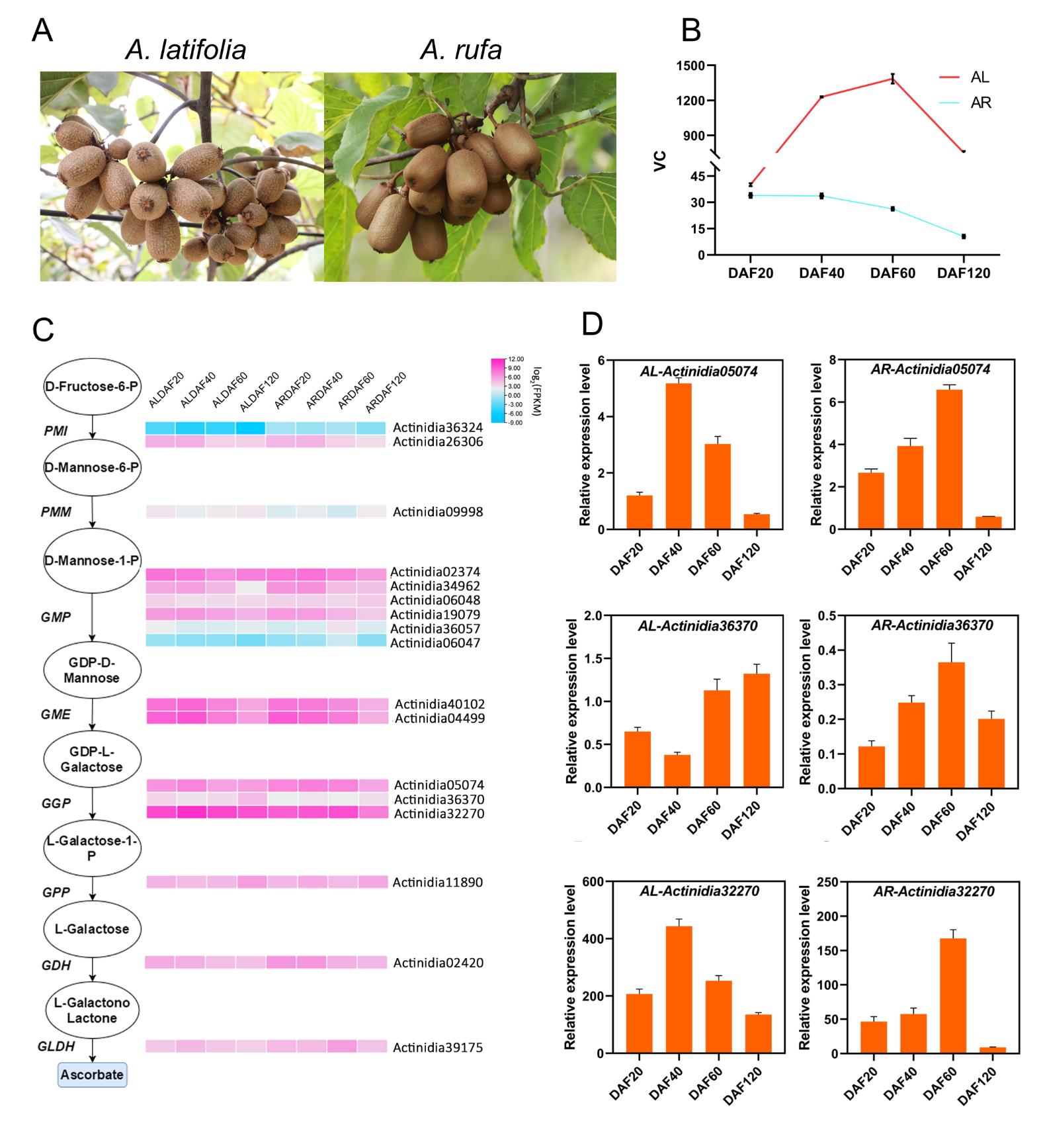 Ascorbic acid (AsA), also called vitamin C, is an essential antioxidant molecule in plant and animal metabolism. Lack of AsA can cause various diseases in humans, and human diet must incorporate fresh fruits or vegetables, which are the primary sources of AsA. Actinidia (kiwifruit) is known as the king of vitamin C concentration. However, there are significant differences in AsA content among different kiwifruit species, and the molecular mechanism of AsA synthesis was still unclear.