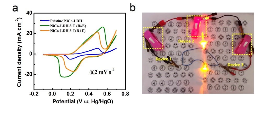 Figure 3. (a) Electrochemical performances of samples prepared under magnetic fields; (b) LED lights were successfully driven by as-assembled devices. (Image by LI Hui)