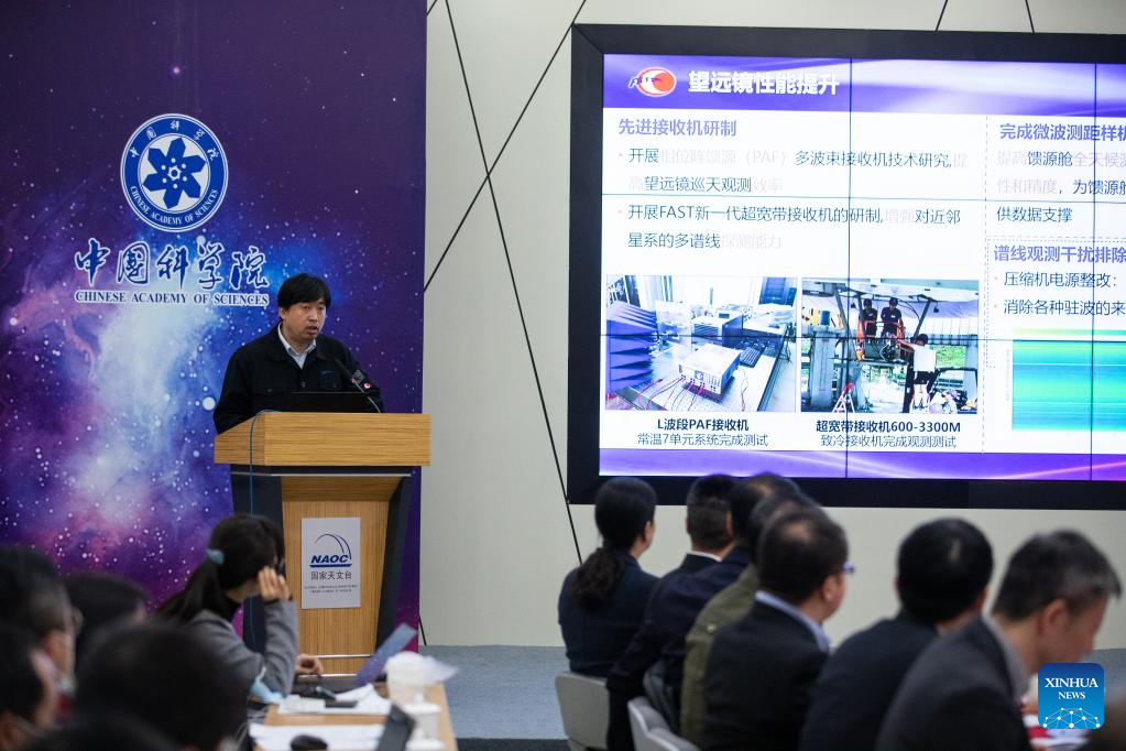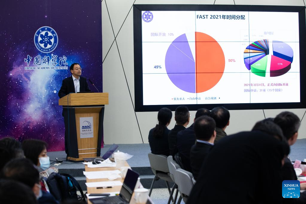 Jiang Peng, chief engineer of China's Five-hundred-meter Aperture Spherical Radio Telescope (FAST) with the National Astronomical Observatories of China (NAOC) of the Chinese Academy of Sciences, speaks at a press conference held in Beijing, capital of China, Jan. 5, 2022. (Xinhua/Jin Liwang)