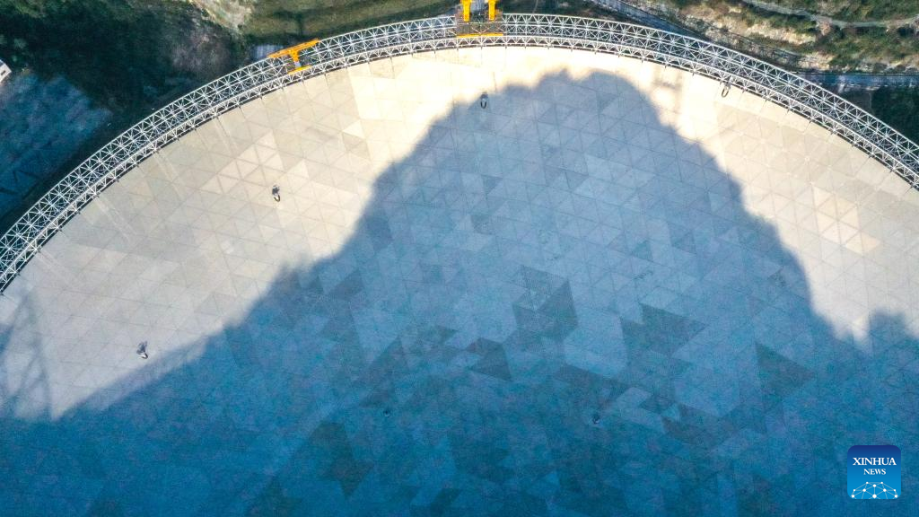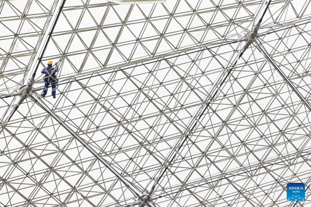 A staff member checks reflector panels during a regular maintenance operation to the Five-hundred-meter Aperture Spherical Radio Telescope (FAST) in southwest China's Guizhou Province, Dec. 17, 2021.(Xinhua/Ou Dongqu)
