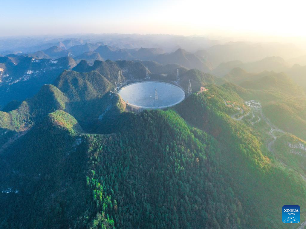 Aerial photo taken on Dec. 19, 2021 shows a view of China's Five-hundred-meter Aperture Spherical Radio Telescope (FAST) under maintenance in southwest China's Guizhou Province. (Xinhua/Ou Dongqu)