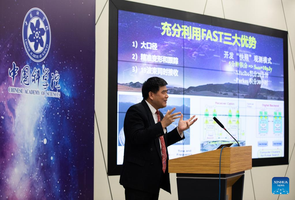 Li Di, a scientist of China's Five-hundred-meter Aperture Spherical Radio Telescope (FAST), speaks at a press conference held in Beijing, capital of China, Jan. 5, 2022. (Xinhua/Jin Liwang)