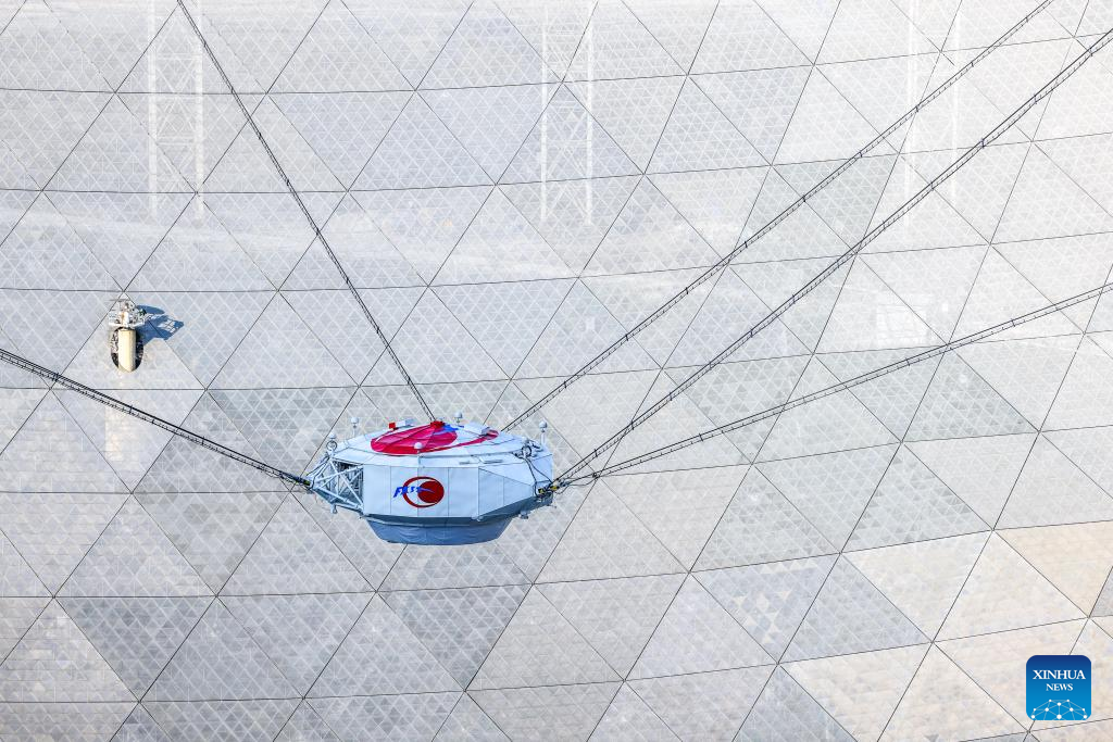 Photo taken on Dec. 17, 2021 shows the feed cabin during a regular maintenance operation to the Five-hundred-meter Aperture Spherical Radio Telescope (FAST) in southwest China's Guizhou Province. (Xinhua/Ou Dongqu)