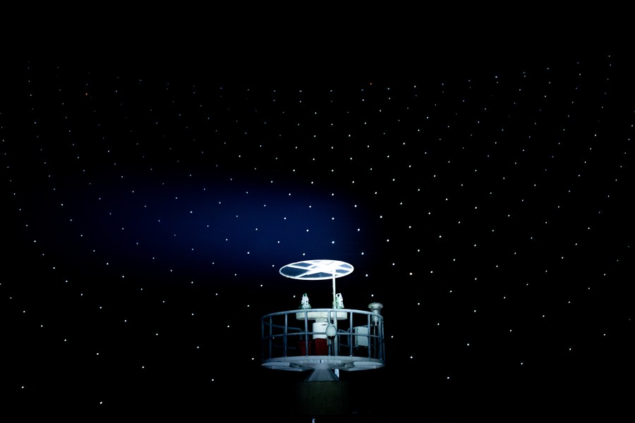 Photo taken on March 29, 2021 shows China's Five-hundred-meter Aperture Spherical Radio Telescope (FAST) under maintenance at night in southwest China's Guizhou Province. (Xinhua/Ou Dongqu)
