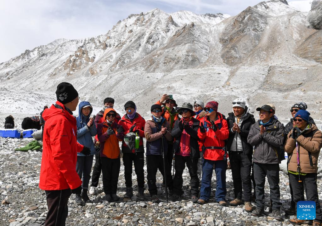 Kang Shichang (1st L), leader of a scientific research team, inspires his team members before a scientific expedition at the Mount Qomolangma base camp, May 1, 2022. (Xinhua/Jiang Fan)