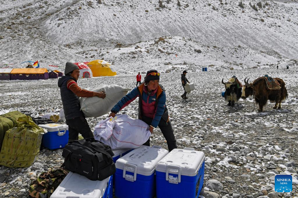 Workers transport supplies for a scientific expedition at the Mount Qomolangma base camp, May 1, 2022. (Xinhua/Jiang Fan)