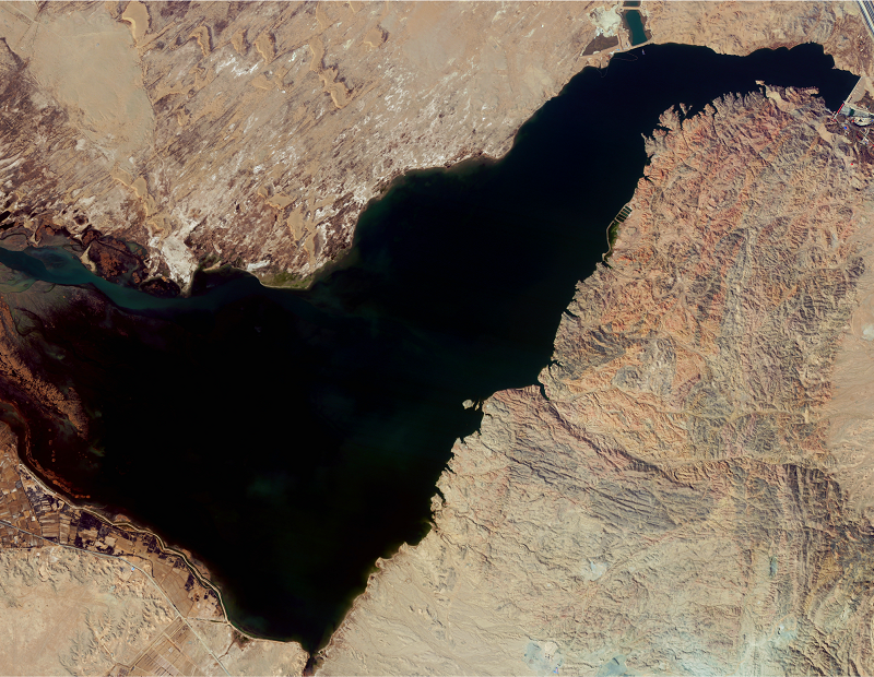 A photo from the Jilin-1 satellite shows a small lake on the edge of the city in the Mingsha Mountain in Dunhuang, Gansu province. [Photo by Changguang Satellite Technology/For chinadaily.com.cn]