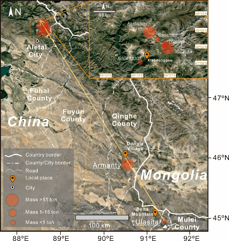 China has successively discovered the meteorite irons at a weight of 28 tonnes, 23 tonnes, 18 tonnes, five tonnes and 0.43 tonnes in Altay. The massive Altay irons were found to comprise the longest known strewn field of about 430 kilometers.