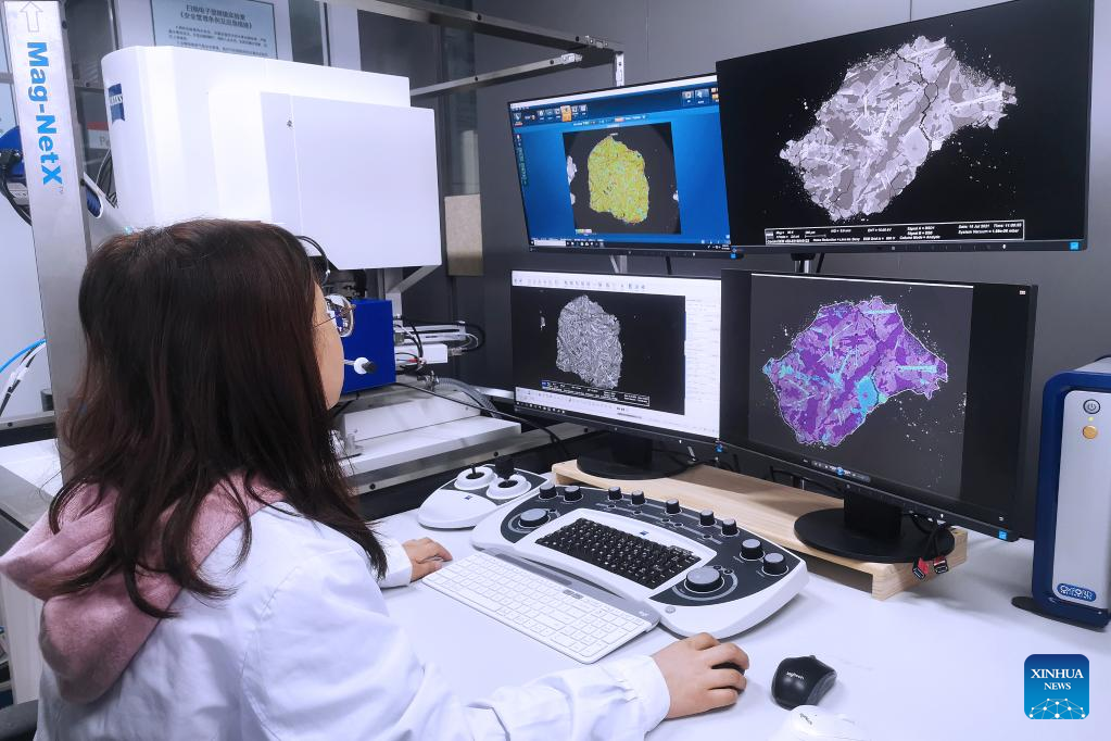 A researcher from the Institute of Geology and Geophysics of the Chinese Academy of Sciences (IGGCAS) analyzes lunar samples returned by China's Chang'e-5 mission in Beijing, capital of China, Oct. 14, 2022. A Chinese group analyzed lunar samples returned by China's Chang'e-5 mission and proposed a new mechanism for how young volcanos took shape on the cooling moon 2 billion years ago. (Institute of Geology and Geophysics of the Chinese Academy of Sciences/Handout via Xinhua)