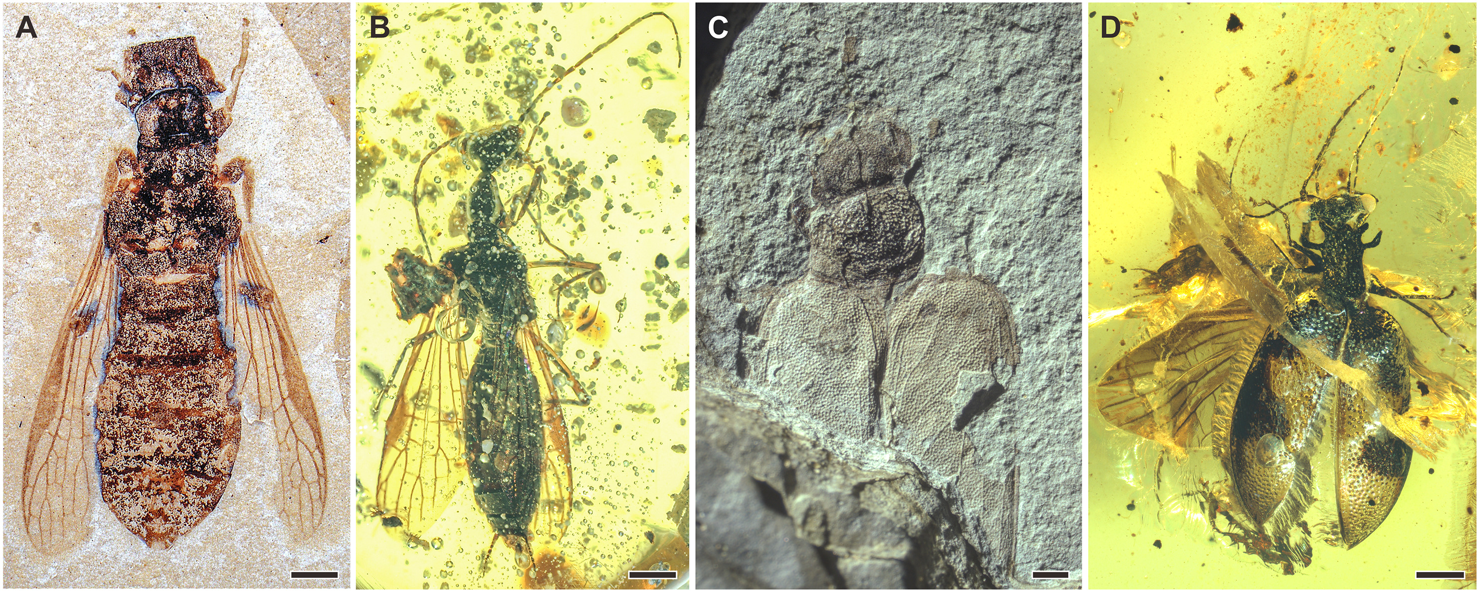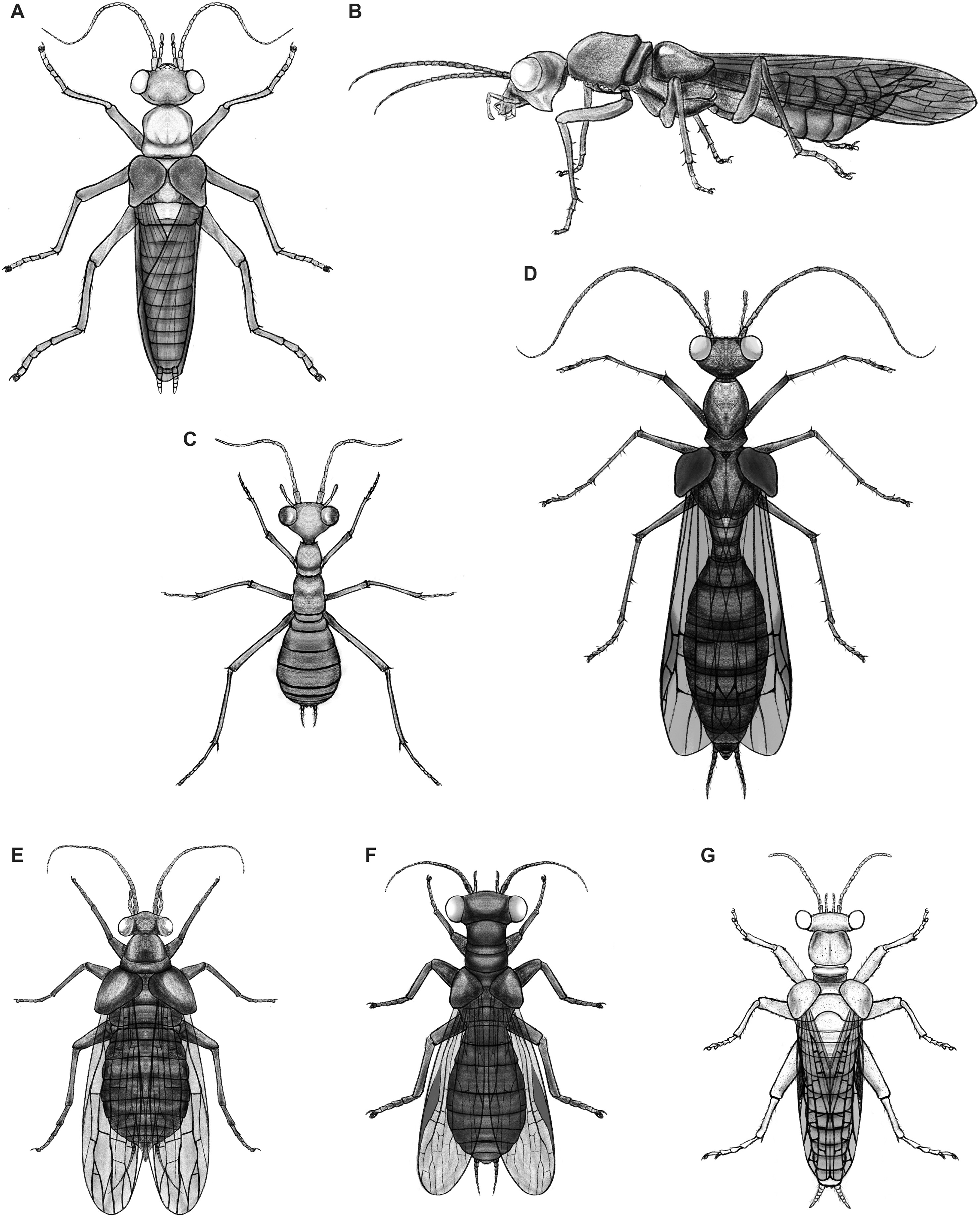 The researchers confirmed that thoraco-abdominal waist-like constrictions of some of the alienopterid adults (adults of those ant mimics) resemble Hymenoptera. The strongly shortened forewings of some alienopterid adults closely resemble the tegulae of Hymenoptera and the hind wing is structurally similar to hymenopteran wings. But the body shape and size of some of these alienopterid adults are similar to some large aculeate Hymenoptera from the same deposit, especially ampulicid wasps.