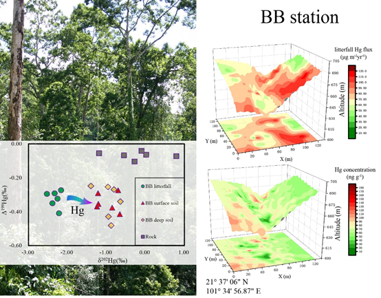 As a global pollutant, mercury (Hg) is emitted directly into the atmosphere from geogenic and anthropogenic sources and previously deposited Hg in natural surfaces. Previous studies in subtropical evergreen forests have shown that climate, vegetation and terrain factors shape Hg accumulation in forest floor. However, few studies have conducted a comprehensive observation of Hg mass balance in tropical forests.