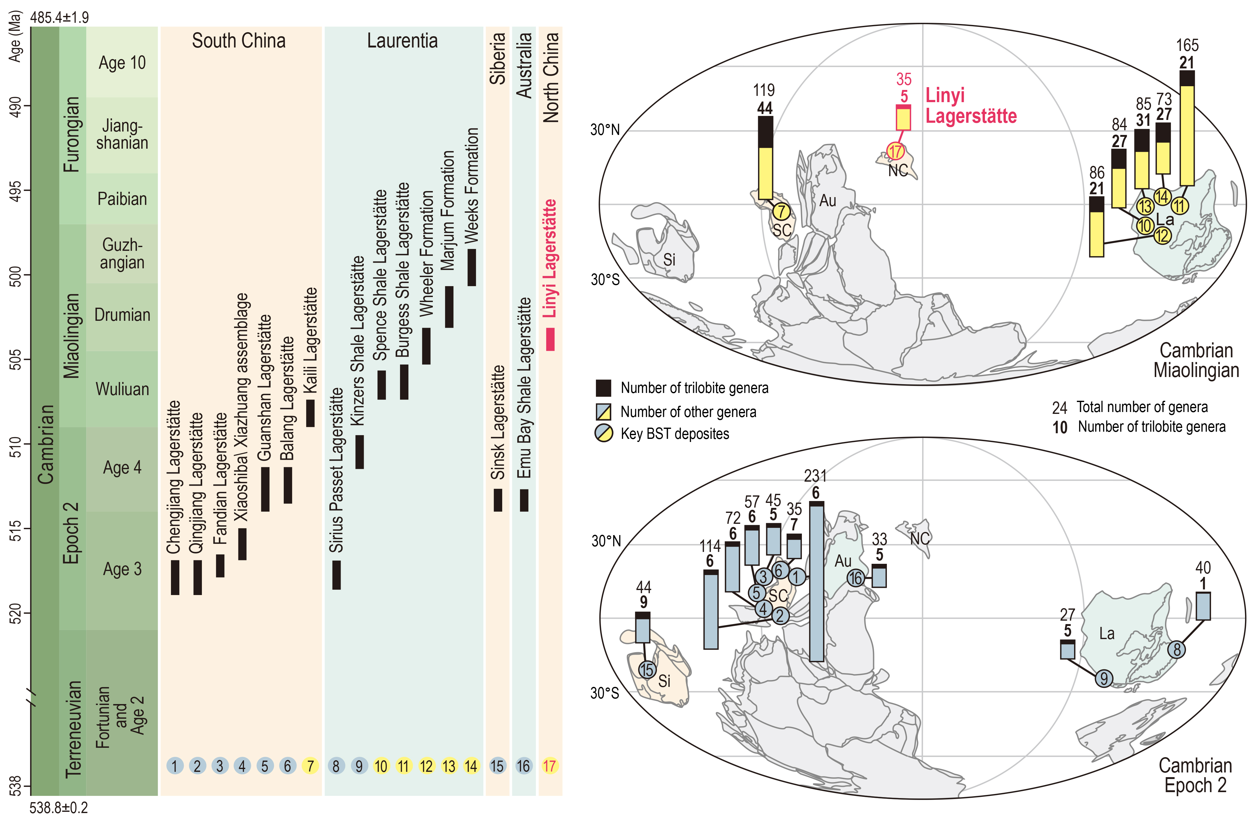Fig. 1 Spatial and temporal distribution and taxonomic diversity of 16 major Cambrian lagerstätten, and the position of the Linyi Lagerstätte (Image by NIGPAS)