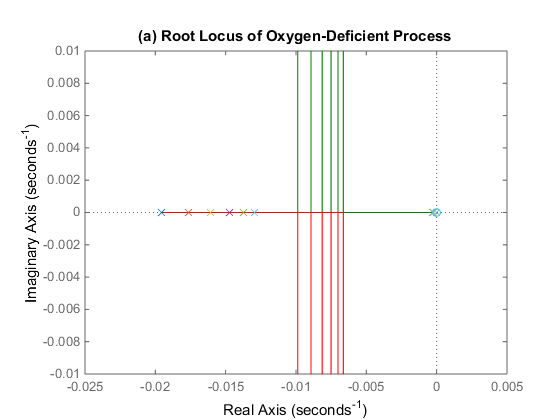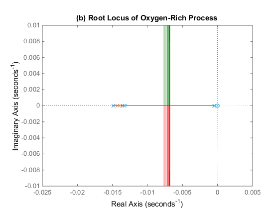 Fig. 1. The root locus plots of the seven linearized models at different equilibrium points: (a) 3O2 deficient case, (b) 3O2 rich case. (Image by SIBET)