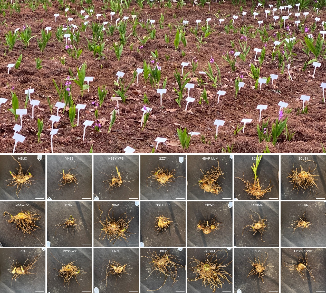 The upper shows the common garden experiments of 33 geographic populations of Bletilla wild resources. The lower dispicts the phenotypic differences of pseudobulbs in different populations. (Image by WBG)