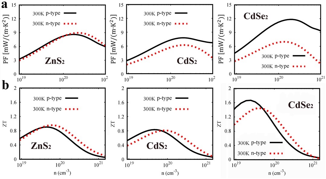 Figure 3. Calculated power factors (a) and figures of merit (b) as functions of the carrier concentration for p-type and n-type doping at 300 K in ZnS2, CdS2 and CdSe2 (from left to right), respectively. (Image by JIA Tiantian)