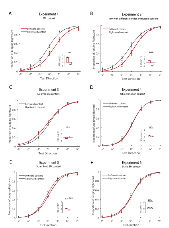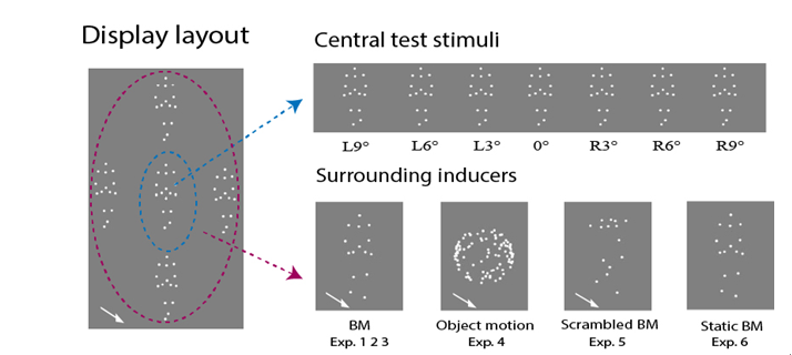 Through six experiments, they tested how the judgment of the walking direction of a central walker was affected by surrounding walkers (point-light biological motion) who walked leftward and rightward, respectively.