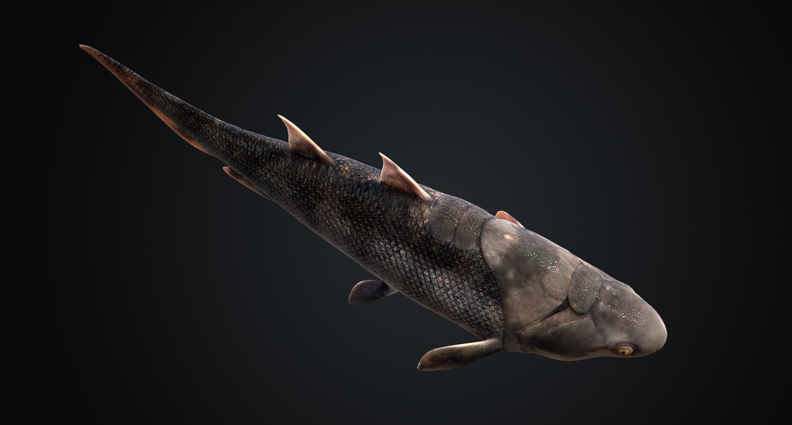 The authors reported two species. The first one and the most abundant species was named Xiushanosteus mirabilis. It is a tiny, 3-cm-long placoderm or armored jawed fish. The flat and semicircular head, along with the trunk armor, are reminiscent of its jawless ancestors, but its paired fins and powerful tail made Xiushanosteus a much more capable swimmer.