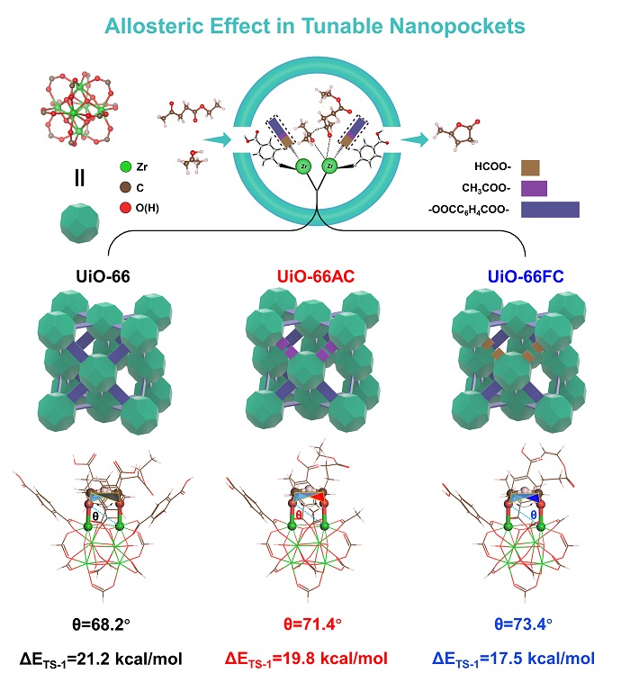 In a study published in Science Advances, a team led by Prof. TANG Zhiyong and Prof. LI Guodong from the National Center for Nanoscience and Technology (NCNST) of the Chinese Academy of Sciences reported the fabrication of enzyme-mimetic nanopockets inside a typical MOF UiO-66, by coordinating zirconium node with terephthalate ligands and various monocarboxylate modulators, including formic acid, acetic acid, and trifluoroacetic acid. UiO-66 with tuneable nanopockets showed enhanced activity and selectivity plus great stability in the transfer hydrogenation of biomass derived alkyl levulinates with isopropanol towards value-added gamma-valerolactone (GVL).