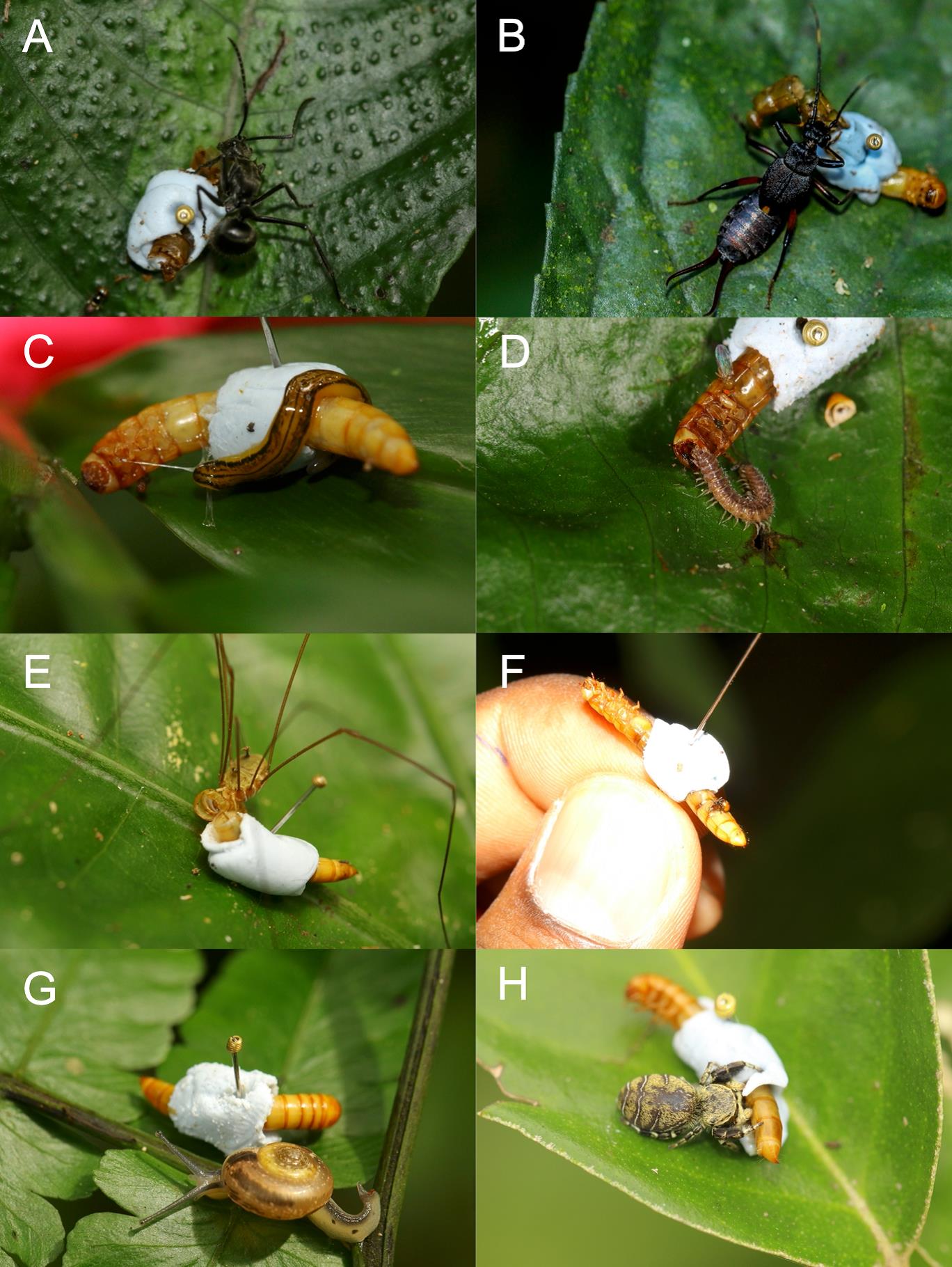 Various invertebrates observed on live mealworms (Tenebrio molitor) deployed in a monsoonal tropical rainforest of south-eastern China: (A) ant, (B) dermapteran, (C) platyhelminth, (D) centipede (also a fly), (E) opilionid, (F) beetle, (G) land snail, and (H) spider. (Images by Thilina S. Nimalrathna)
