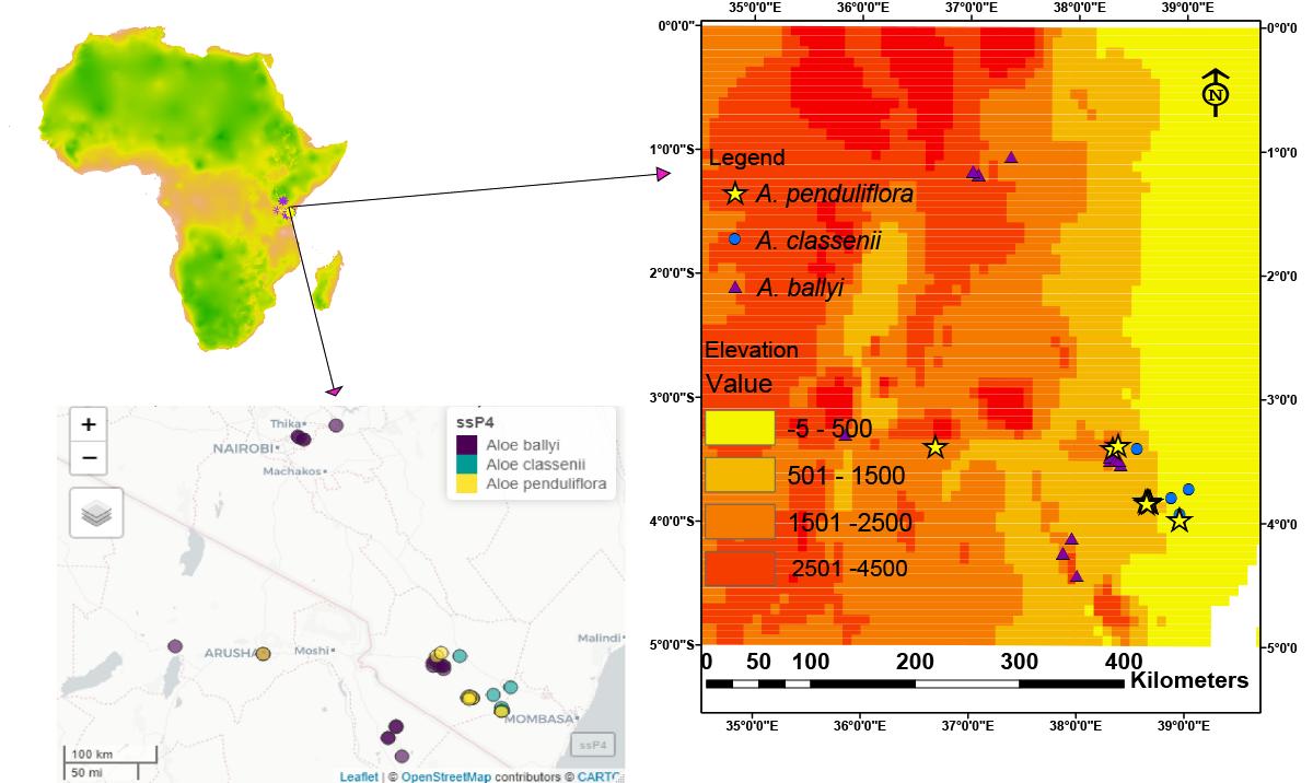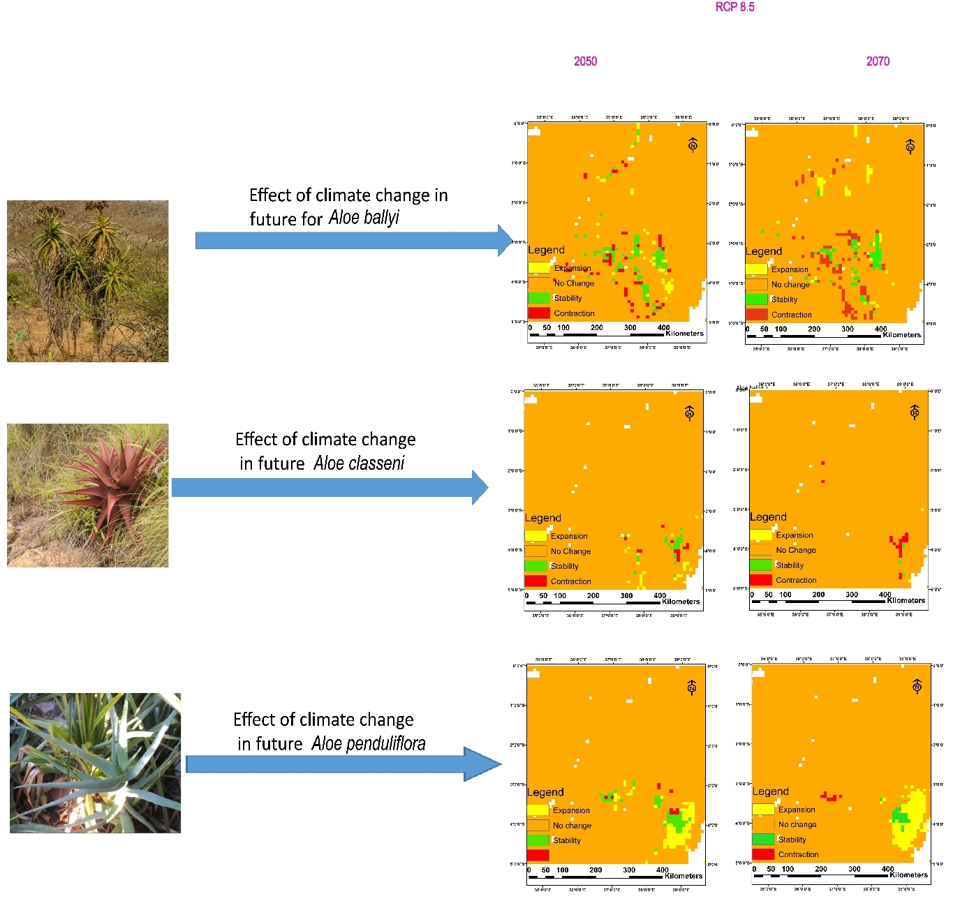 According to the researchers, environmental and bioclimatic variables (potential evapotranspiration, soil sedimentary rocks, temperature and precipitation) had a great impact on the distribution of the three Aloe species. The potential suitable habitats for A.ballyi and A. penduliflora are limited to the coastal region of Kenya and some regions in Tanzania, whereas habitat for A. classenii is limited to a small region in the coastal region of kenya.