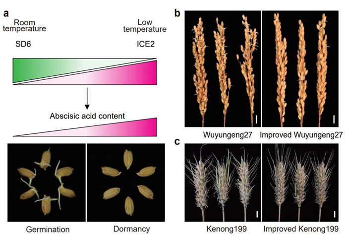 Proposed working model and application of SD6/ICE2 molecular module in rice and wheat. a, proposed working model of SD6/ICE2 molecular module. b,c, the pre-harvest sprouting phenotypes of rice cultivar Tianlong619 (b) and wheat cultivar Kenong199 (c) before and after improvement. (Image by IGDB)