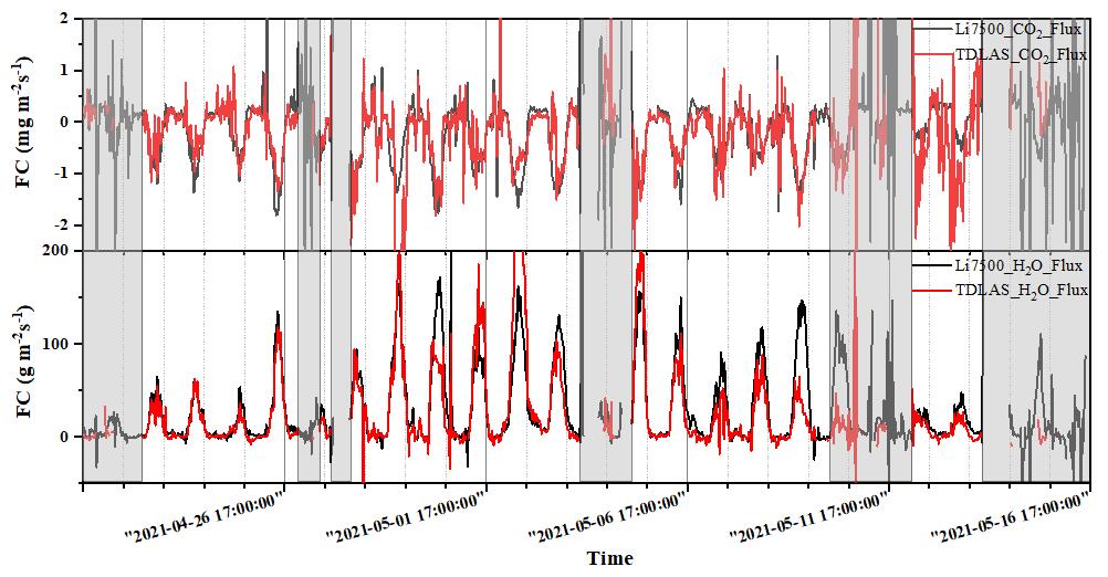 Fig. 3. Comparison of (a) CO2 flux and (b) H2O flux for approximately a month. (Image by GU Mingsi)