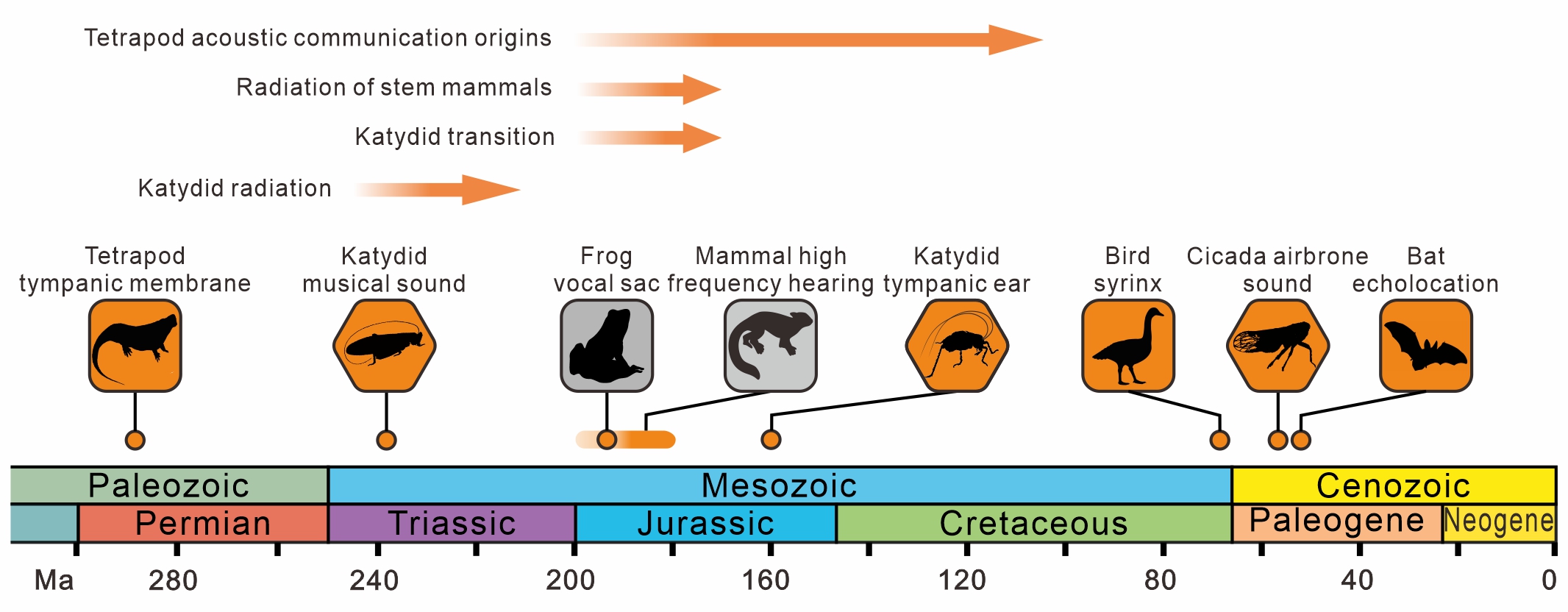 These findings demonstrate that insects, especially katydids, dominated choruses during the Triassic—a situation different from the modern soundscape. After the appearance of birds and frogs in the Jurassic, the forest soundscape became almost the same as the modern one in the Cretaceous, except lacking the sound of cicadas (which have fewer musical calls). These results also highlight the ecological significance of insects in the Mesozoic soundscape, which has hitherto been largely unknown in the palaeontological record.