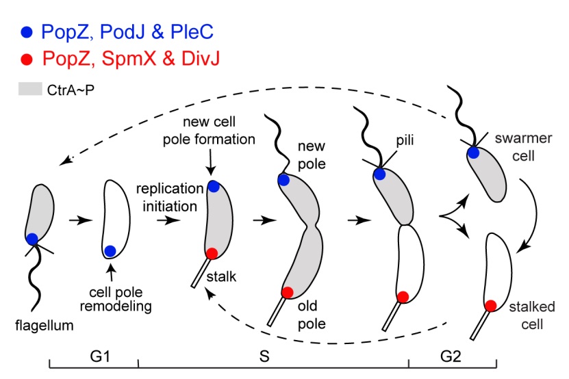 As a well-established model for studying bacterial ACD, Caulobacter crescentus produces a motile swarmer cell and a sessile stalked cell during each cell cycle. In the pre-division cell stage, the polarization of new-pole signaling proteins by the scaffold PodJ coordinates to modulate the phosphorylation levels of a set of downstream signaling proteins, thus determining the cell fate of C. crescentus.