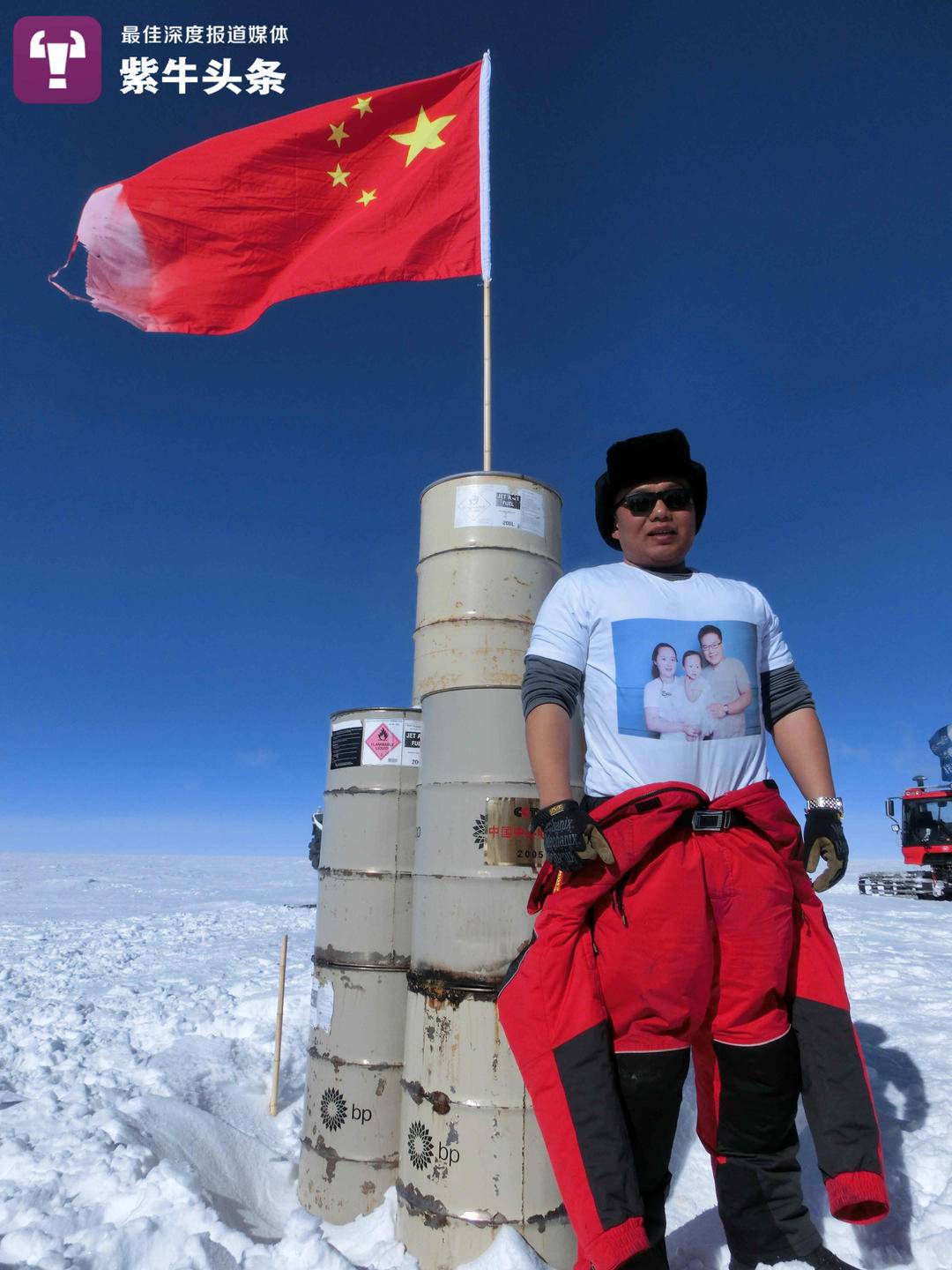 Li Zhengyang poses for a photo at the highest point of Antarctica, wearing a T-shirt with a family photo printed onto its front. (Photo courtesy of Li Zhengyang)