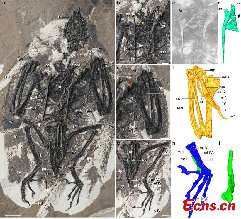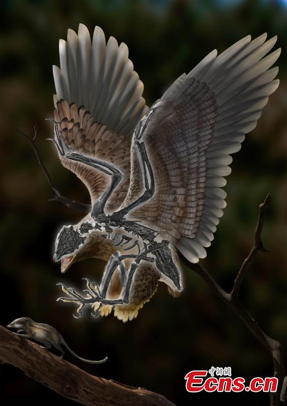 A new, complete 120-million-year-old fossil bird has a dinosaur-like skull articulated with a bird-like body. In addition, the fossil specimen, named Cratonavis zhui, preserves a surprisingly elongate scapula and first metatarsal, making it stand out from all other birds including fossil ones. (ECNS)