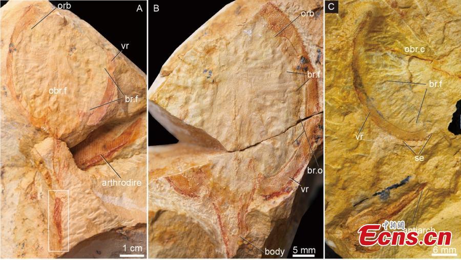 Photo shows a complete headshield articulated with body and tail preserved together with a complete arthrodiran fish. (Photo provided to China News Service)