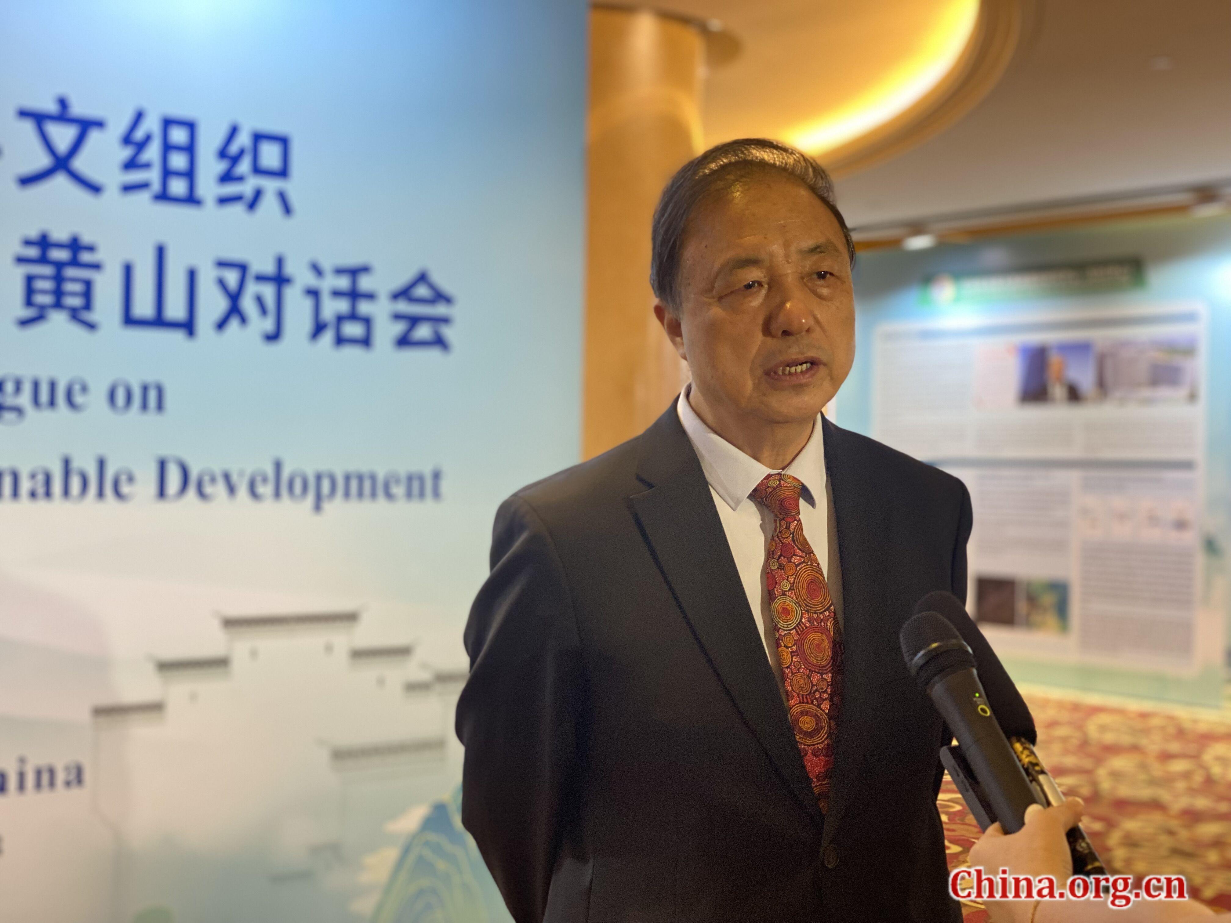 Guo Huadong, director of the International Centre on Space Technologies for Natural and Cultural Heritage under the auspices of UNESCO and academician of the Chinese Academy of Sciences, gives an interview during the 4th Huangshan Dialogue, June 30, 2023. [Photo by Wang Wei/China.org.cn]