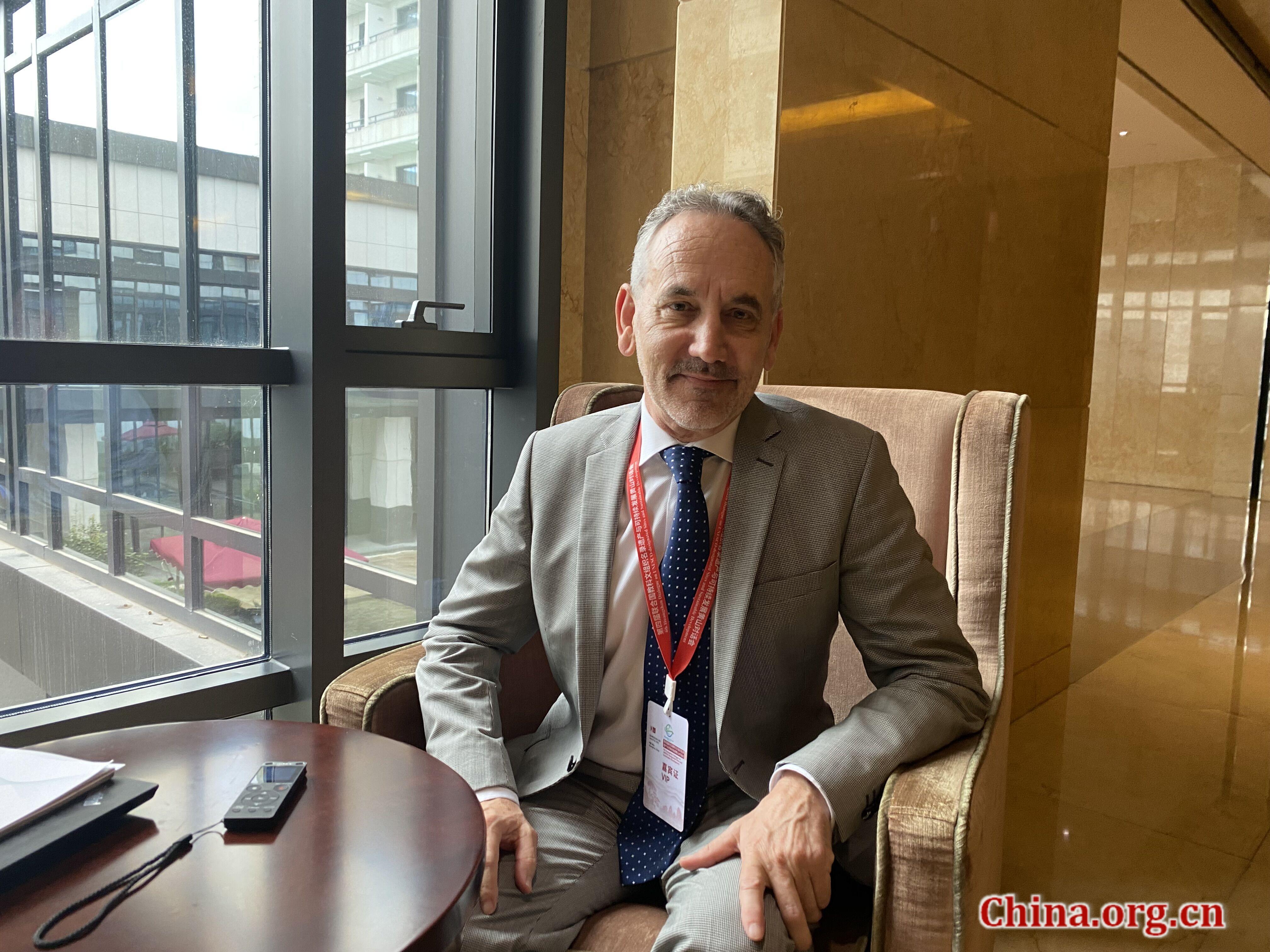 Peter Shadie, former director of the IUCN World Heritage Programme and a visiting professor at HIST, gives an interview during the 4th Huangshan Dialogue, June 30, 2023. [Photo by Wang Wei/China.org.cn]