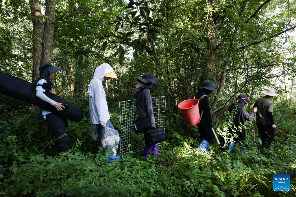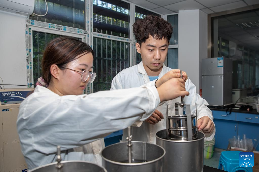 Researchers of the Institute of Mountain Hazards and Environment under Chinese Academy of Sciences (CAS) assess water-stable soil aggregate at a research station in Zhongxian County, southwest China's Chongqing, July 5, 2023. (Xinhua/Chu Jiayin)
