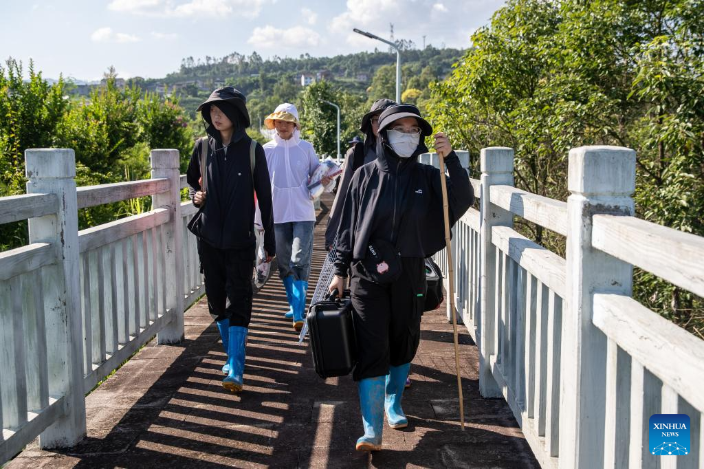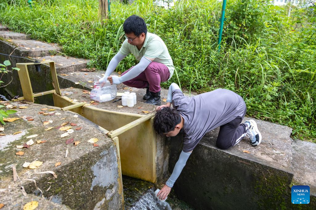 Researchers of the Institute of Mountain Hazards and Environment under Chinese Academy of Sciences (CAS) collect water samples in Zhongxian County, southwest China's Chongqing, July 6, 2023. (Xinhua/Huang Wei)