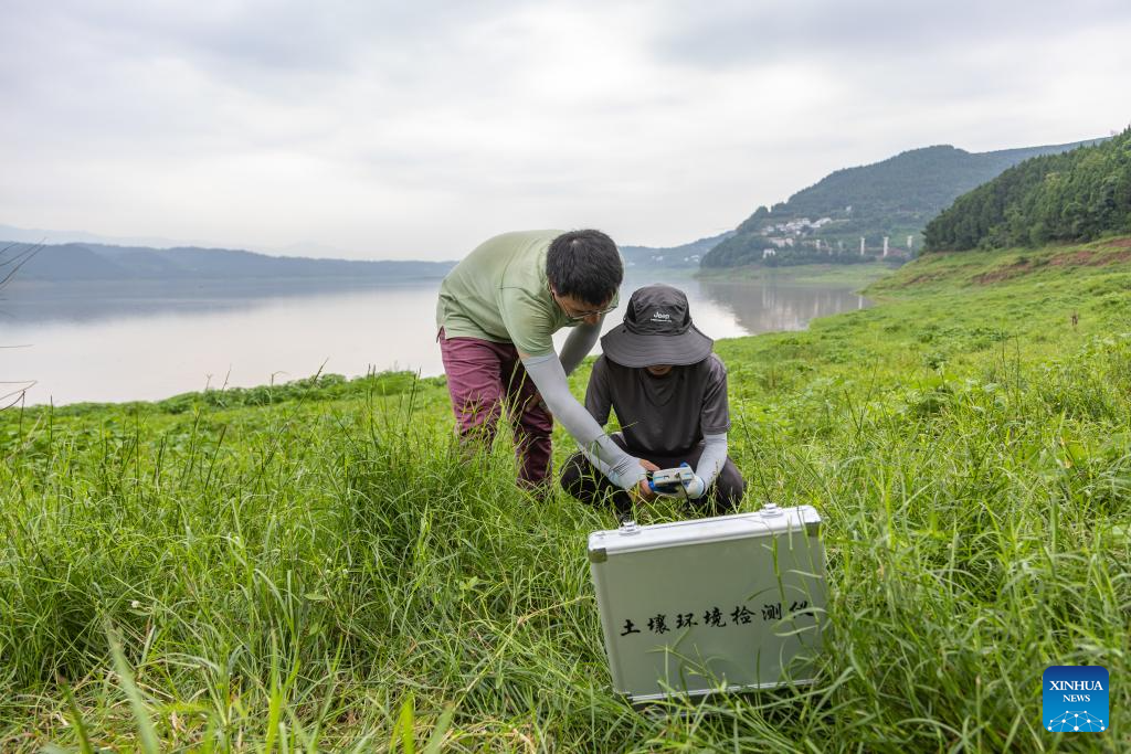 Researchers of the Institute of Mountain Hazards and Environment under Chinese Academy of Sciences (CAS) measure soil temperature and humidity at a water-level fluctuation zone of the Three Gorges Reservoir in Zhongxian County, southwest China's Chongqing, July 6, 2023. (Xinhua/Huang Wei)