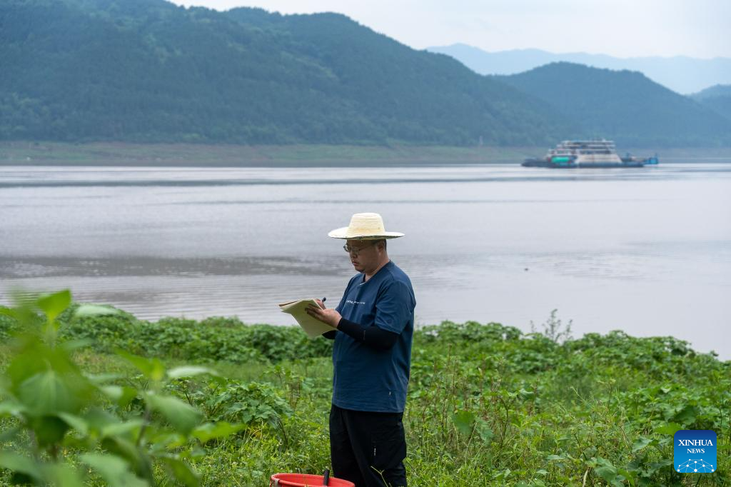 A researcher of the Institute of Mountain Hazards and Environment under Chinese Academy of Sciences (CAS) carries out scientific monitoring at a water-level fluctuation zone of the Three Gorges Reservoir in Zhongxian County, southwest China's Chongqing, July 6, 2023. (Xinhua/Zhou Dixiao)