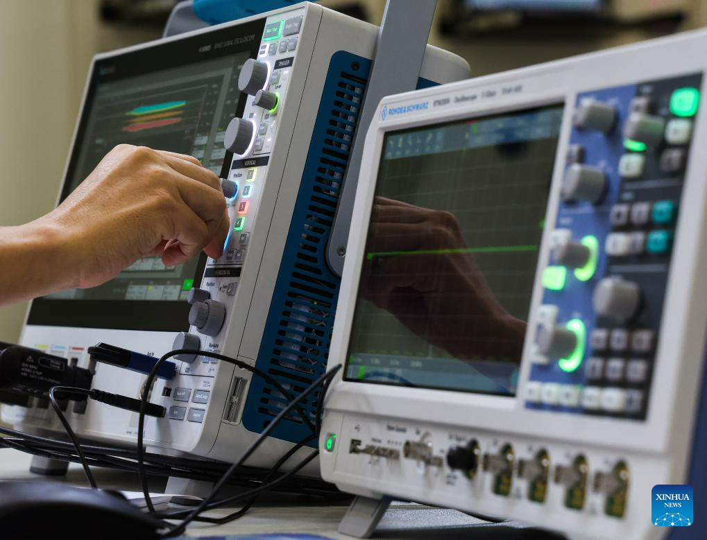 A researcher operates equipment at the accelerator radio frequency technology laboratory of China Spallation Neutron Source (CSNS) in Dongguan, south China's Guangdong Province, July 18, 2023. (Xinhua/Liu Dawei)