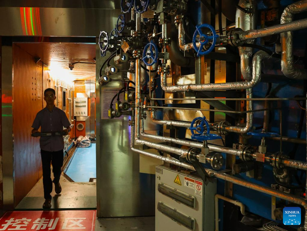 A researcher walks out of the control area of the very small angle neutron scattering (VSANS) of China Spallation Neutron Source (CSNS) in Dongguan, south China's Guangdong Province, July 18, 2023. (Xinhua/Liu Dawei)