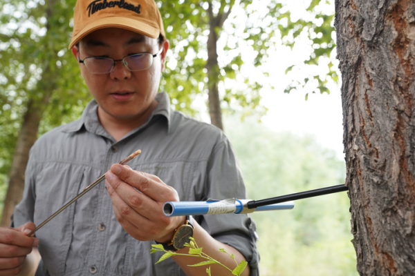 In a shelterbelt forest on the northern slope of the Tianshan Mountains in northwest China's Xinjiang Uygur Autonomous Region, Jia Xiaoxu is drilling the core of a poplar tree.