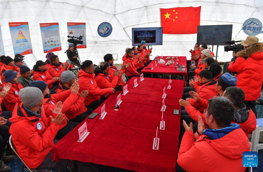 An Baosheng, on-site commander of the Mount Cho Oyu expedition, declares success of the scientific research at a base camp at the altitude of 4,950 meters on Mount Cho Oyu, Oct. 1, 2023. A Chinese expedition team comprising 18 members reached the summit of Mount Cho Oyu, also known as Mt. Qowowuyag, at 9:15 a.m. on Sunday to carry out scientific research on the world's sixth-highest peak. (Xinhua/Jigme Dorje)