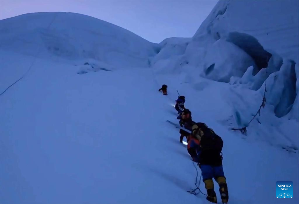 Members of a Chinese expedition team head for the summit of Mount Cho Oyu on Oct. 1, 2023. A Chinese expedition team comprising 18 members reached the summit of Mount Cho Oyu, also known as Mt. Qowowuyag, at 9:15 a.m. on Sunday to carry out scientific research on the world's sixth-highest peak. (Xinhua)