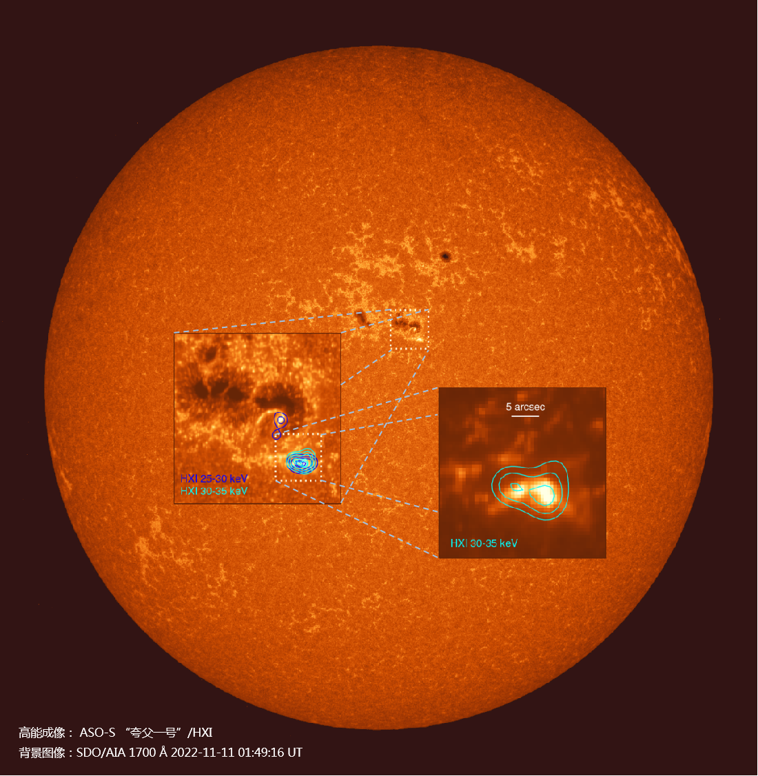The hard X-ray of a C-class solar flare (in squares) captured by China's ASO-S' HXI on November 11, 2022, overlaid on the imaging of the sun's atmosphere, or chromosphere (bottom), observed by NASA's Solar Dynamics Observatory imaged at the same time. /Chinese Academy of Sciences