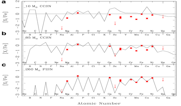 Fig.1: Comparison of observed abundances and models. The chemical abundances of J1010+2358 compared with the predictions from three theoretical supernova models. The error bars are 1σ uncertainties of the observed abundances. (Credit: NAOC)