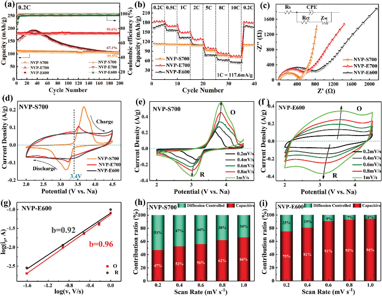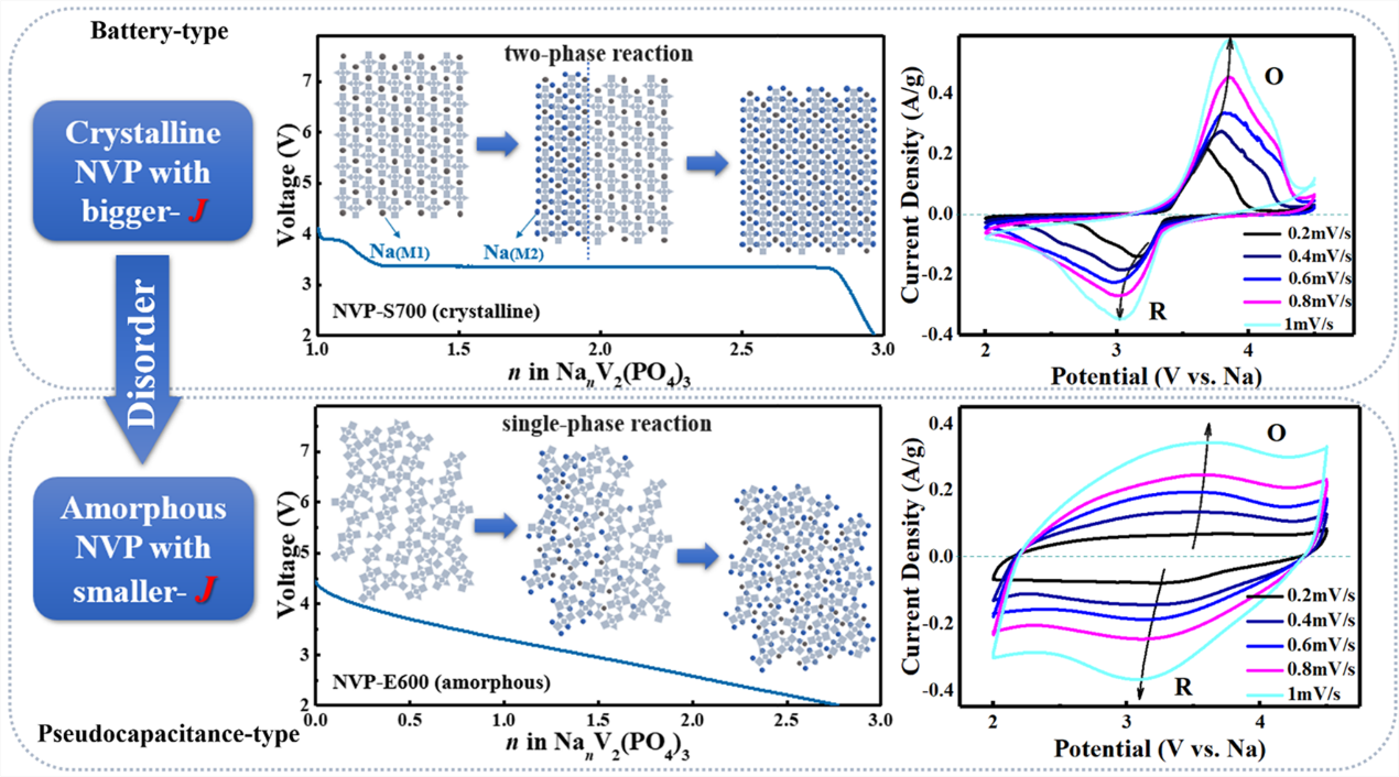 The test results of electrochemical impedance spectrum and cyclic voltammetry curves show that this disordered NVP material has strong electrochemical reaction kinetics, and the charge storage was mainly pseudocapacitive, which is very different from the crystalline NVP with battery-type charge storage behavior.