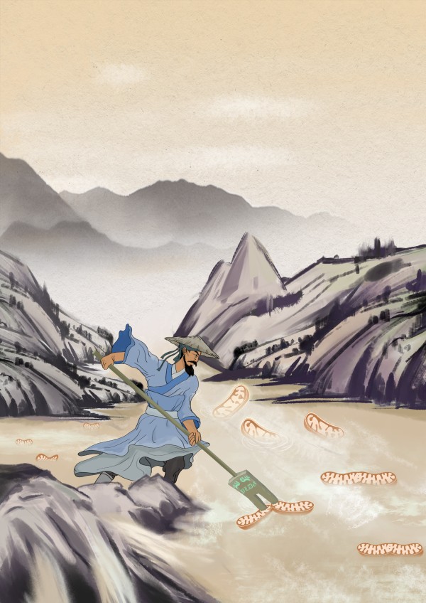 Emperor Yu Tames the Flood. The cover adopts the concept of ancient Chinese myth and legend "Emperor Yu Tames the Flood". Yellow River, the "mother river of China" represents the germline which is the vehicle of reproduction. The artifact leisi handheld by Dayu represents the mitochondrial fusion factor in germline-Pld6. Emperor Yu governances mitochondrial fusion by Pld6 in the germline (Yellow River), thus ensuring the balance of self-renewal and differentiation of GSPCs. (Image by IHB)