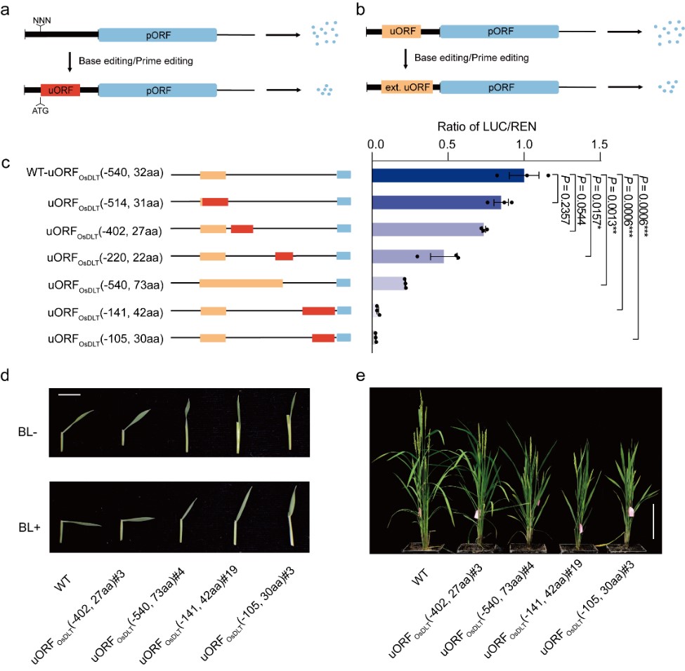 Breeding plants with a predicted phenotype by engineering uORFs. a. Repressed protein expression by generating de novo uORFs; b. Repressed protein expression by extending endogenous uORFs; c. Downregulating protein expression in a graded fashion by producing uORFs with diverse inhibitory activities; d, e. BR sensitivity (d) and morphology (e) of wild type (WT) plants and T1 progenies of edited plants carrying the engineered uORFs. (Image by IGDB)