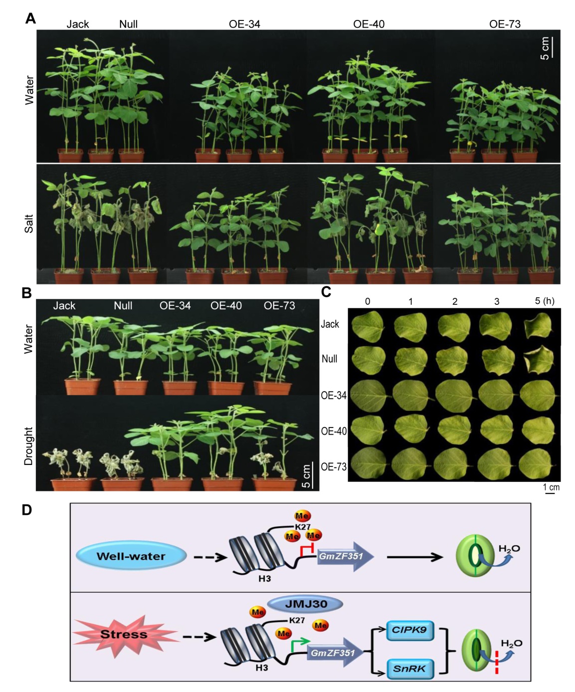 Performance of the GmZF351 transgenic soybean plants and its working model in stress tolerance. A. Performance of the GmZF351 transgenic plants under salt stress. Jack is the original control cultivar. Null is segregated from heterozygous transgenic plants and without transgene insertion. OE-34/40/73 indicate independent homozygous transgenic lines; B. Performance of the transgenic plants under drought stress; C; Comparison of water loss in detached leaves at different times; D. A working model of GmZF351 in stress response. Under normal well-watered condition, the histones H3K27 is highly methylated at the promoter region of GmZF351, blocking gene expression. Under stress, the histone demethylase JMJ30 is induced and the methylation of H3K27 is reduced, allowing activation of GmZF351 and subsequent downstream gene expression for stomata closure and stress tolerance. (Image by IGDB)