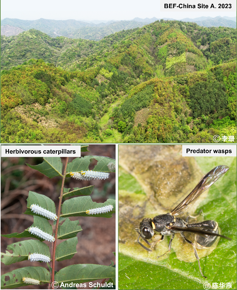 Fig. 1 BEF-China experiment sites (photo by Shan Li), herbivorous caterpillars feeding on tree leaves (photo by Andreas Schuldt), and a predator wasp predating leaf-mining caterpillar (Image by CHEN Huayan)