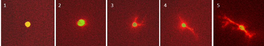 A spreading stem cell remodels its surrounding matrix. Green: cell; Red: PIC hydrogel. (Image by LIU Kaizheng)